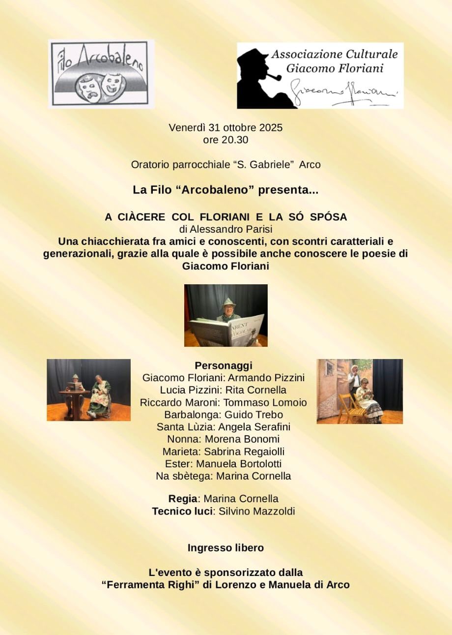 Venerdì 31 ottobre alle 20:30 ospitiamo la Filo Arcobaleno che porterà in scena “A ciàcere col Floriani e la só spósa”, una chiacchierata fra amici e conoscenti, con scontri caratteriali e generazionali, grazie alla quale è possibile conoscere le poesie di Giacomo Floriani