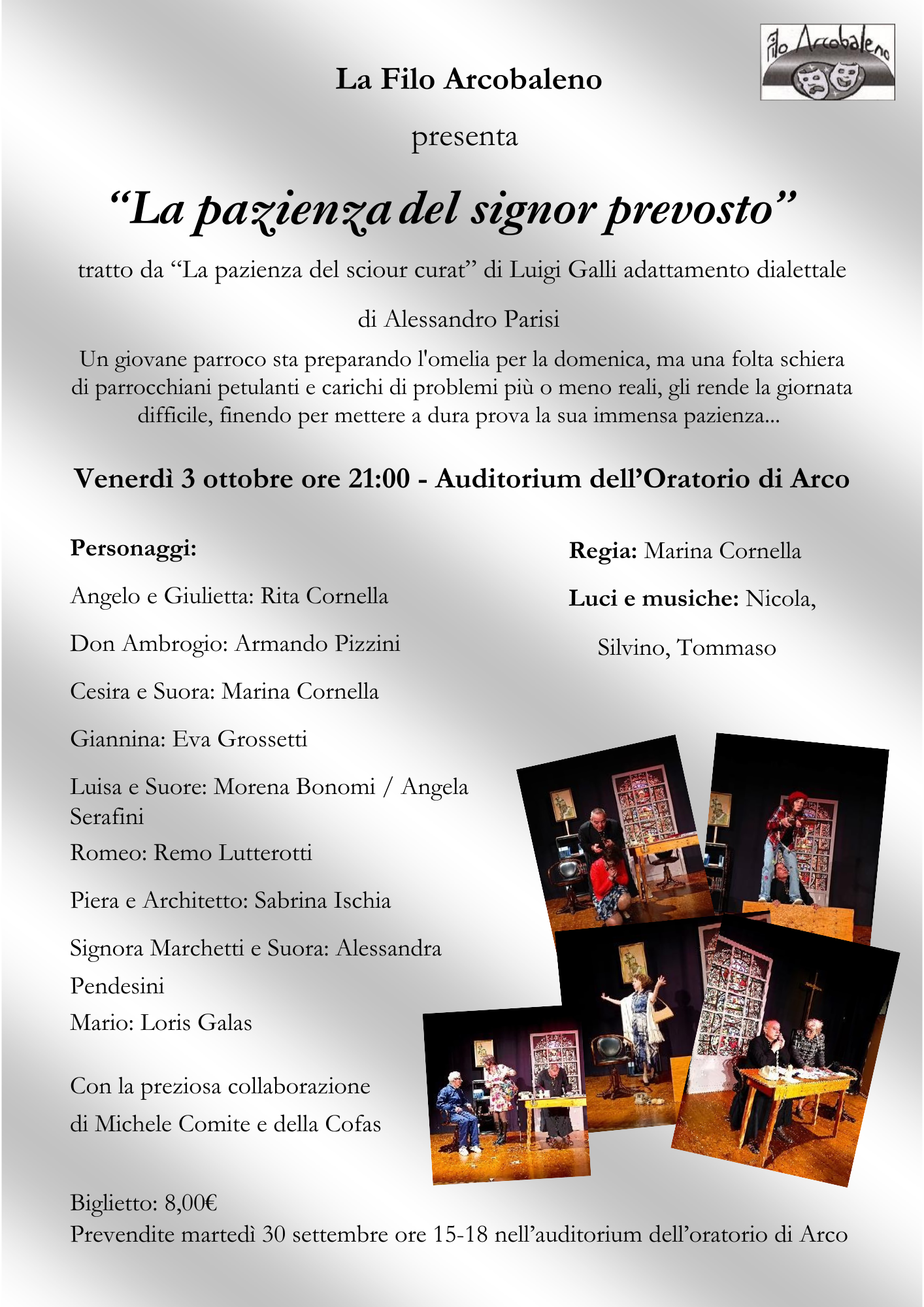 Venerdì 3 ottobre alle 21 la Filo Arcobaleno di Arco metterà in scena sul nostro palco la commedia dialettale La pazienza del signor Prevosto, tratto da “La pazienza del sciour curat” di Luigi Galli adattamento dialettale di Alessandro Parisi.