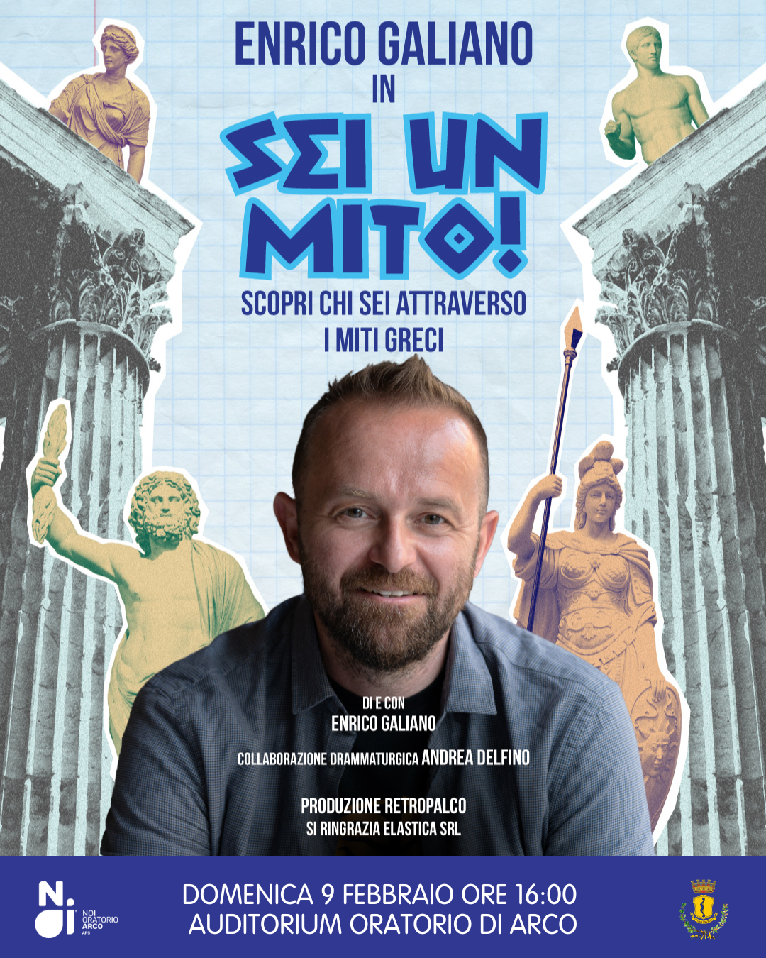Enrico Galiano porta all’oratorio di Arco il suo nuovo progetto Sei un mito! Scopri chi sei attraverso i miti greci. Una lezione-spettacolo ironica e coinvolgente che, attraverso il racconto di miti greci, accompagna il pubblico in un viaggio alla scoperta di sé.